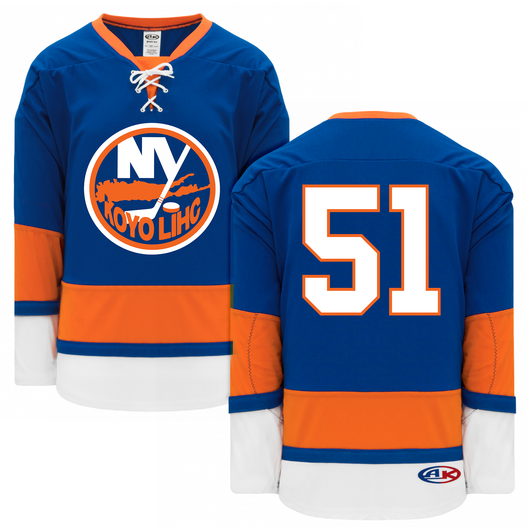 KOYO ISLANDERS design printed on Royal, Orange, White hockey jersey.